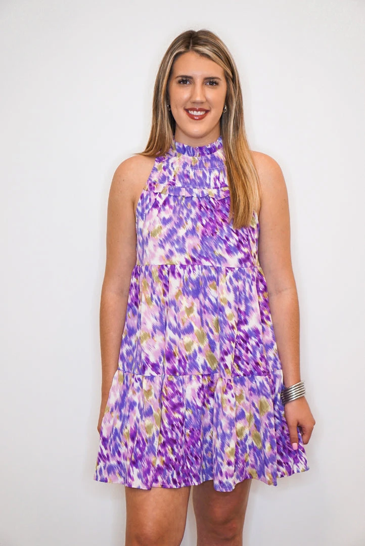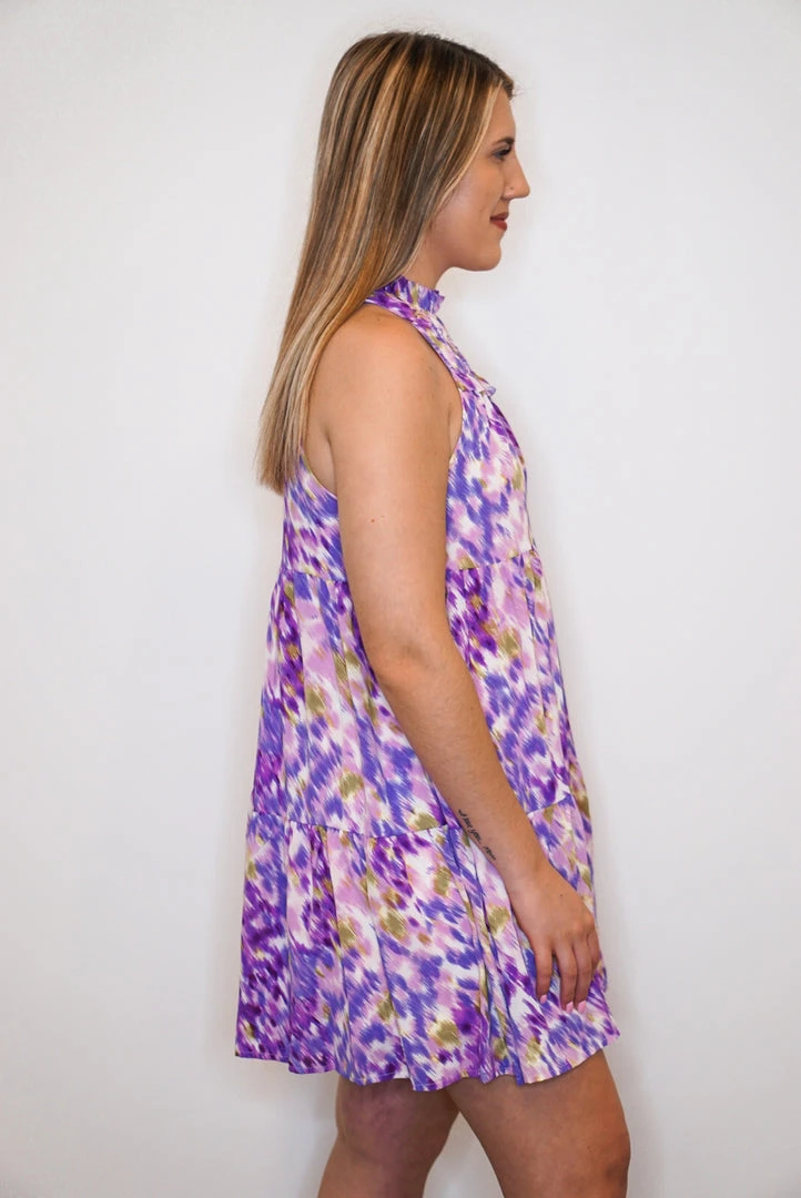 Printed mock neck sleeveless tiered dress featuring ruffle detailing. Keyhole button closure at back.