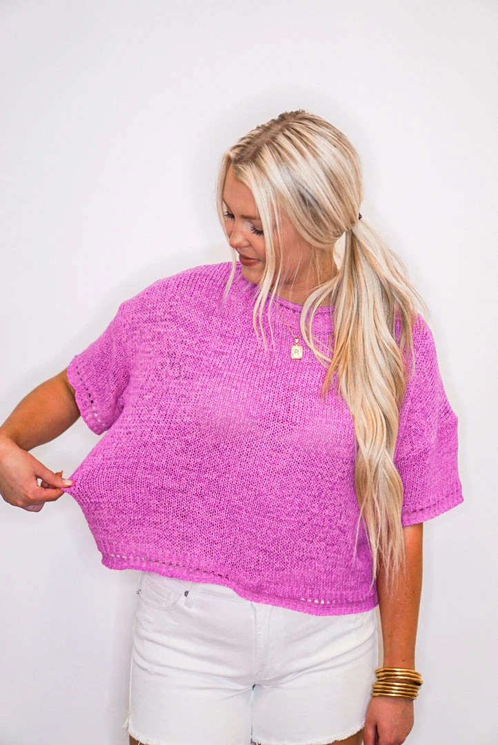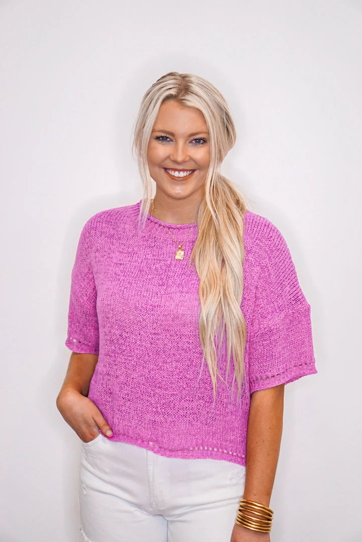 There is such a comfy classic feel to a loose knit Summer top. This cutie is an orchid lightweight loose knit fabric, featuring a ribbed crew neckline, and dropped shoulder with ribbed cuffed short sleeves. Perfect for those warm Summer evenings at the beach!