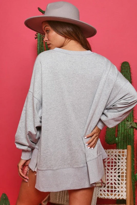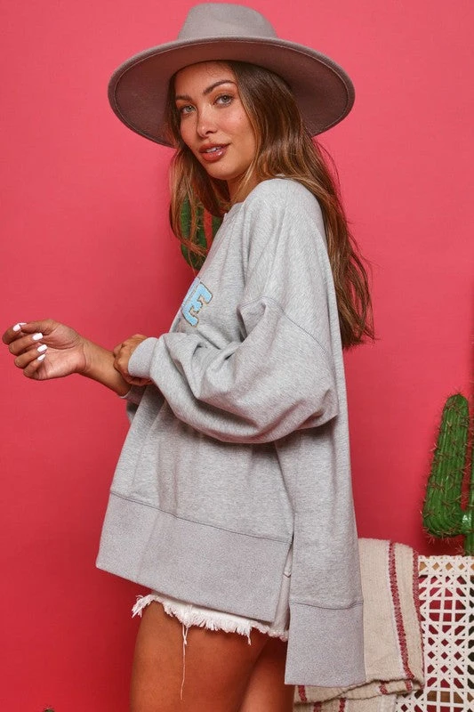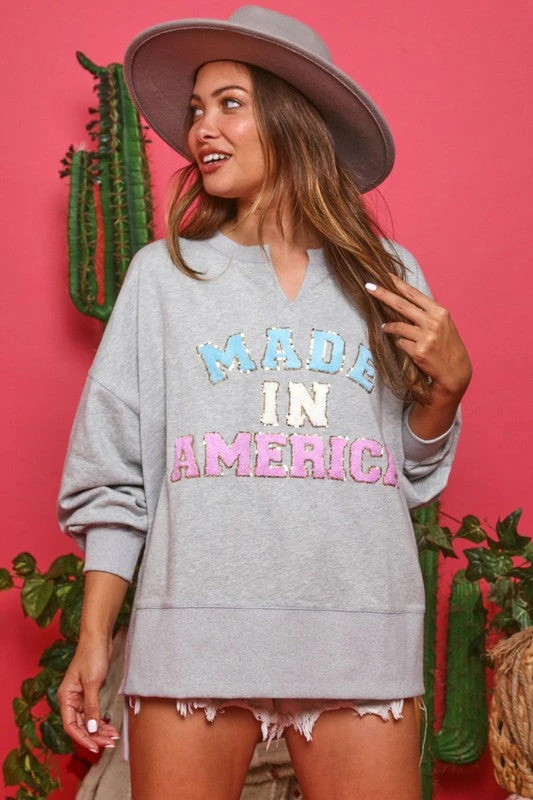 This Made in America patch light weight sweatshirt is perfect for summer beach or lake nights. This cutie has a notch neckline, long sleeves, and high-low side slits.