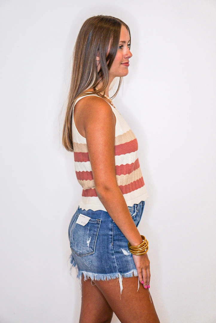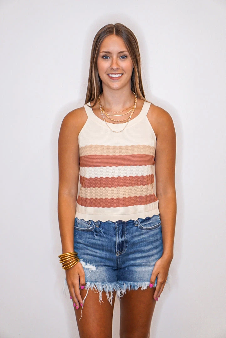 Such a perfect tank top for Summer! Ribbed knit fabric striped with scalloped knit fabric in mauve, taupe, and ivory colors, featuring a crew neckline, and scalloped bottom hemline. This babe is perfect for those hot Summer days. We love love love!