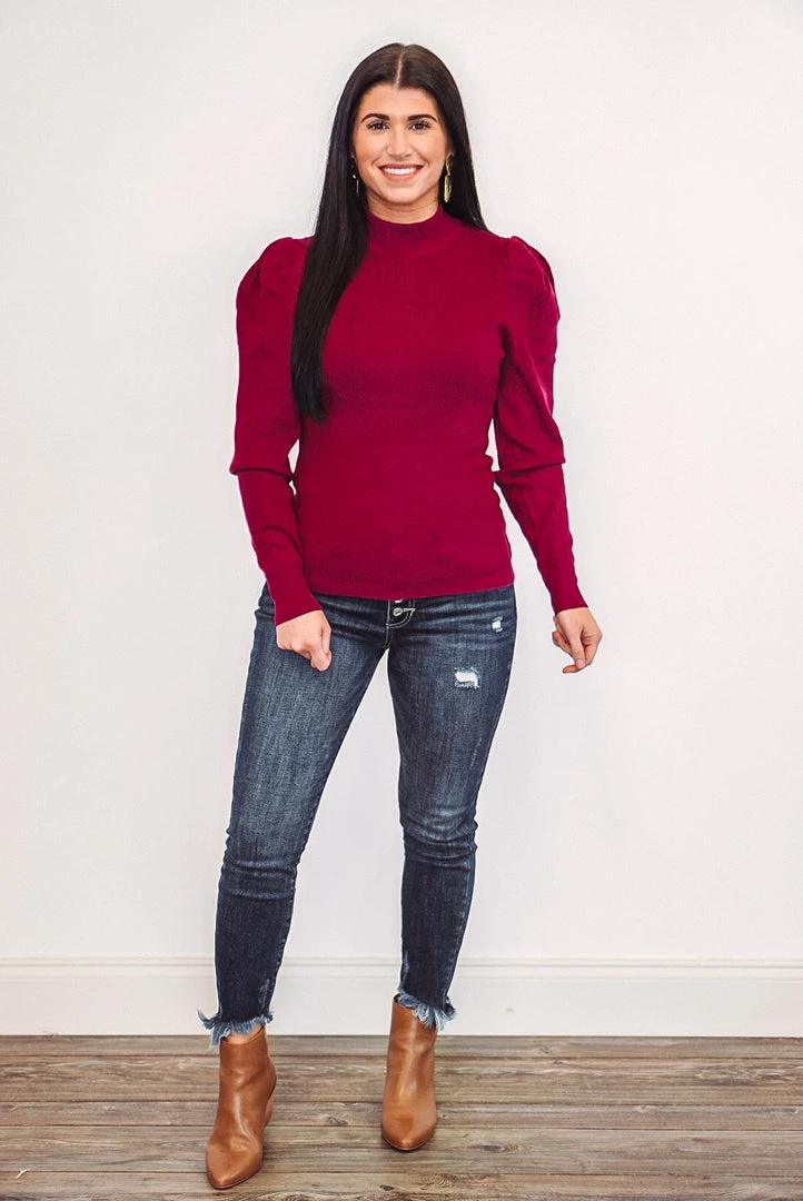 The perfect little sweater! We love the puff sleeve detail, it gives a fun twist to a classic look. This ribbed knit sweater is a fitted cut, and features a mock neck, and cuffed long sleeves. This babe will have you looking and feeling fabulous for all of your upcoming events!