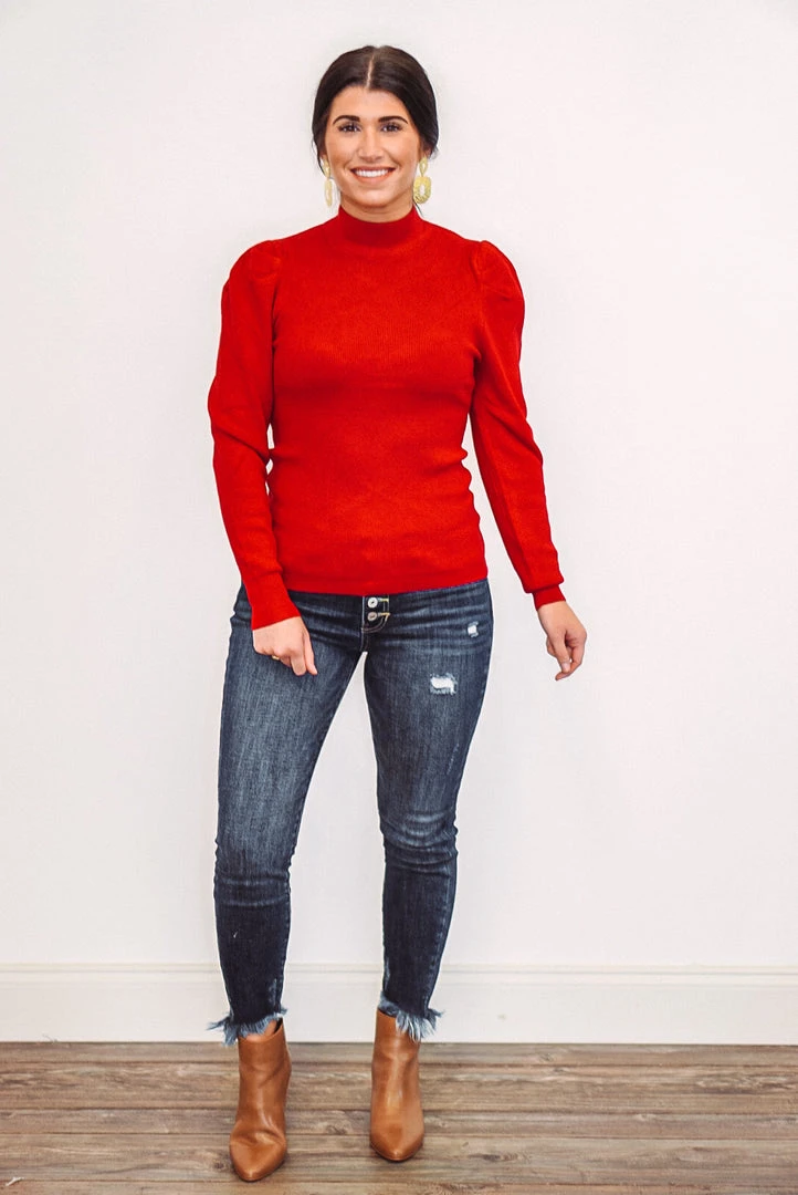 The perfect little sweater! We love the puff sleeve detail, it gives a fun twist to a classic look. This ribbed knit sweater is a fitted cut, and features a mock neck, and cuffed long sleeves. This babe will have you looking and feeling fabulous for all of your upcoming events!