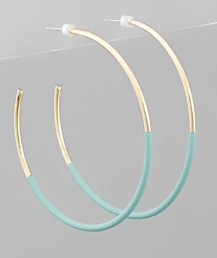 Hoop earrings are a must have this season! We are loving these light green half coated gold hoops. They are perfect for all of your upcoming events!