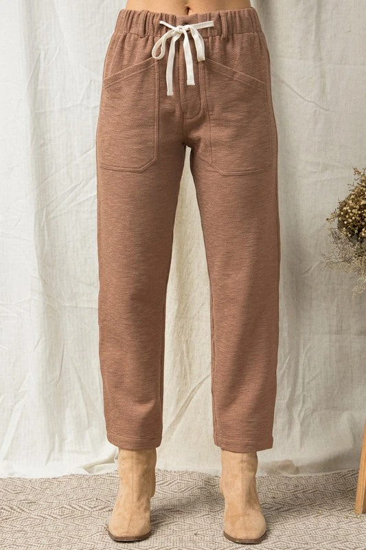 We love a good pair of knit pants, and these babies are super cute! They are mocha knit textured fabric with an elastic waist and drawstring detail, with a functioning button fly front closure, belt loops, and functioning pockets in the front and back. Super comfy and perfect dressed up or down. You’ll want to live in them everyday!