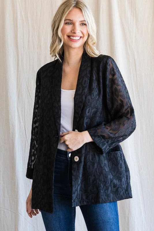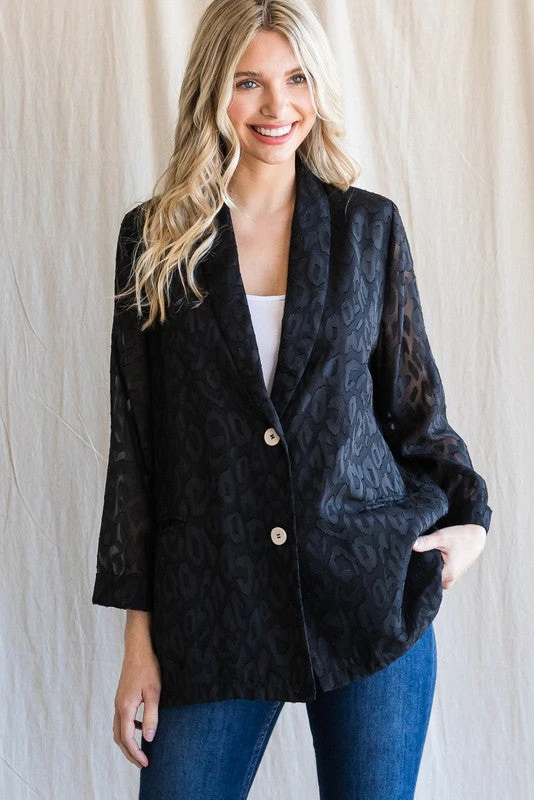 Black satin monochromatic leopard print blazer