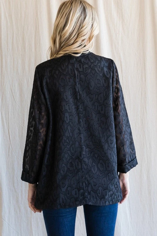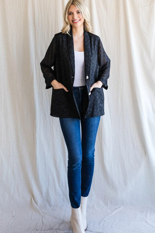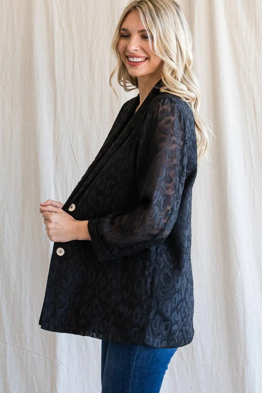 Blazers are all the trend right now, and this one is perfect! This babe is a lightweight black satin leopard print monochromatic fabric. Featuring a collar, permanently rolled long sleeves, two open front pockets, and double button front closure. This baby is CUTE CUTE CUTE!