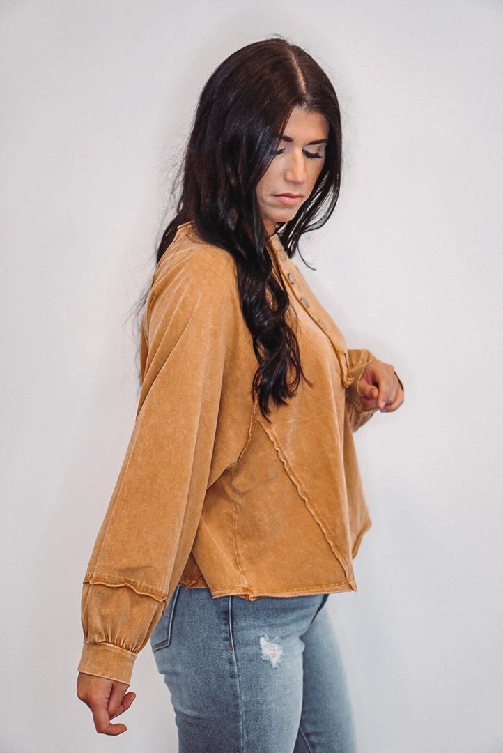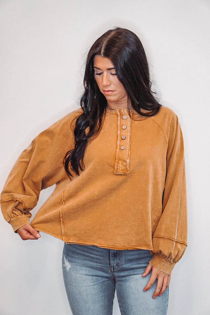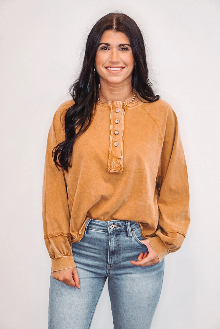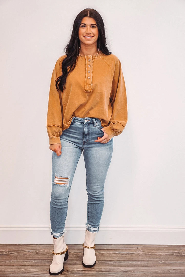 We are having all the love for this knit top! So comfy, and super cute, featuring mineral washed mustard color knit, button closure boat neckline, raw seam details, and dolman long sleeves. You will love how great you feel in this babe, while running errands, hanging out with friends, or enjoying a much deserved day off. Soon to be your new favorite go-to!
