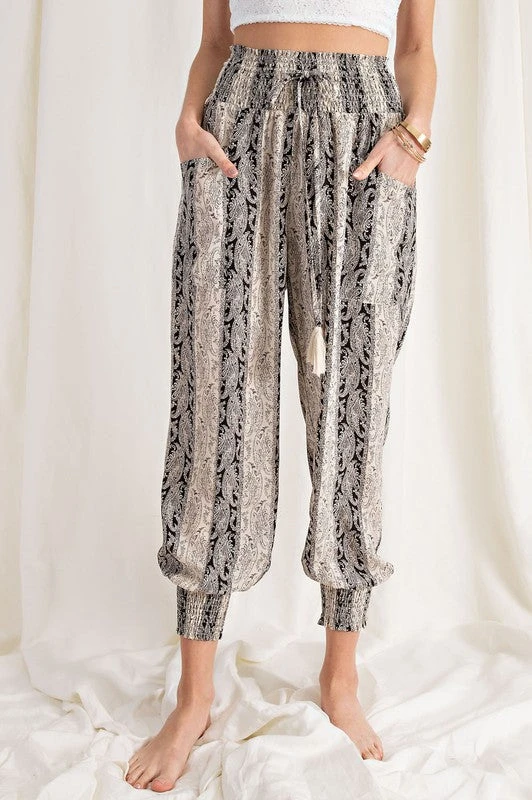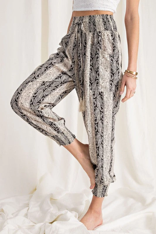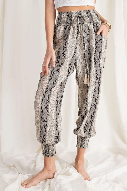 Your very own paisley printed smocked jogger pants! So many details..to the front pockets, silky fabric, smocked (stretch) waistband and tie tassel! We are in love with these pants and we are sure you will be too! Our favorite way to style these are with a classic black top or a fun graphic tee!