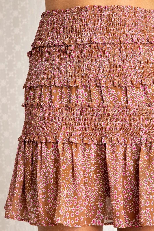 We are in cuteness overload with this adorable mini skirt! With ruffle smocked detailing at the waistline and layered throughout, she is definitely a fan fav! This babe also features a caramel color patterned with multi floral print colors of light pink, dark pink, and ivory and is a fitted silhouette. Super cute and fun! Perfect for those hot evenings out, then when the weather cools, throw her on with a denim jacket and boots and wear her right through all of the upcoming seasons!