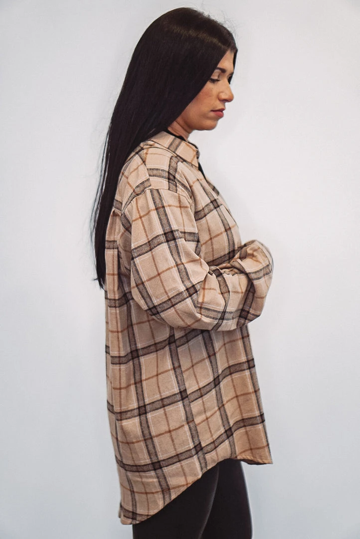 Tan, ivory, black and caramel plaid flannel oversized shirt