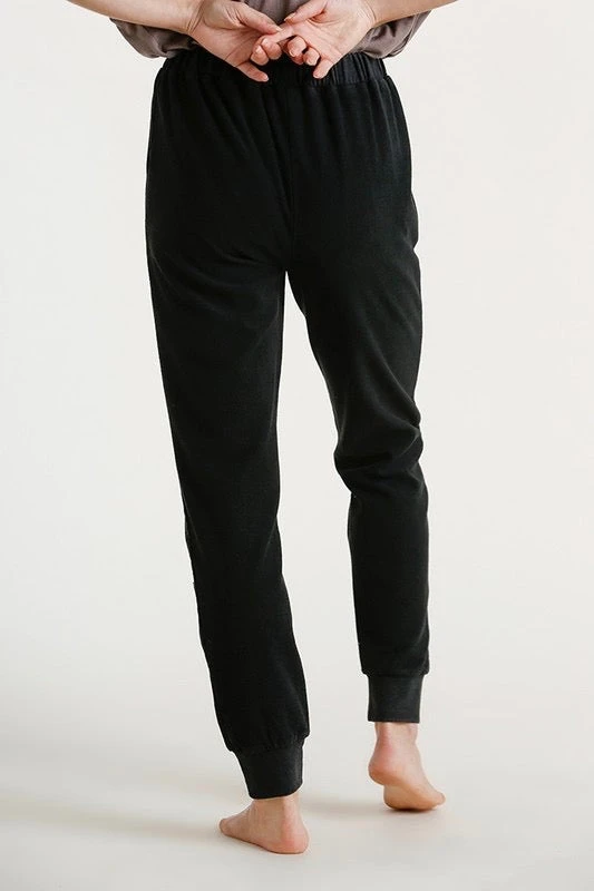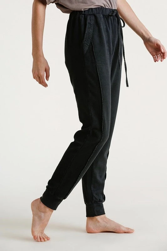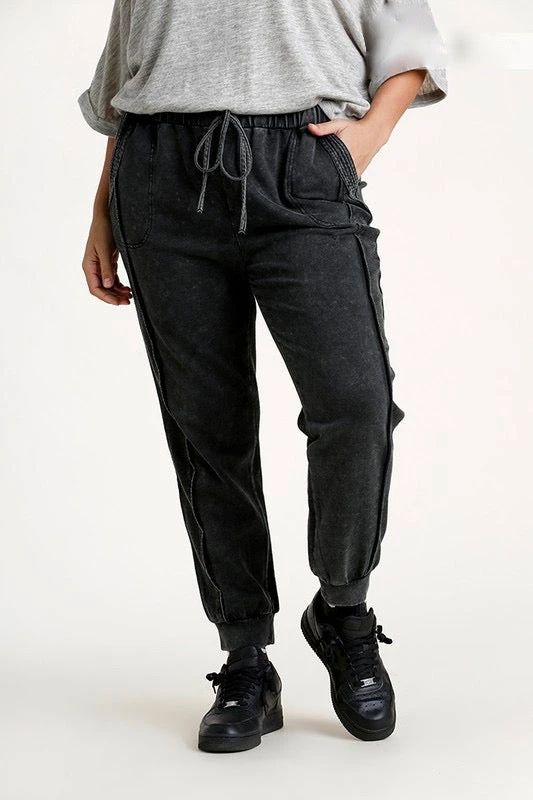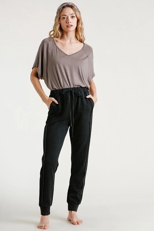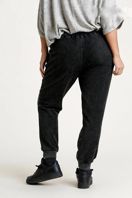 We are having all the feels for these black french terry knit joggers! So comfy, and super cute, featuring our favorite mineral washed fabric, front pockets, raw hemline details and a decorative tie on the elastic waistband. You will love how great you feel in these babies, while running errands, hanging out with friends, or enjoying a much deserved day off. Perfect for all of the places life takes you! Pair these sweet babes with the Keeping Cozy matching pullover top.