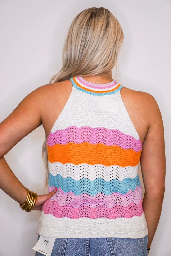 Such a perfect halter top for Summer! Ribbed knit fabric striped with scalloped knit fabric in cream, pink, lavender, orange, and teal colors. This babe is perfect for those hot Summer days. We love love love!