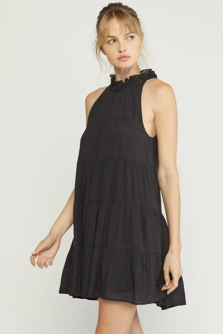 Black sleeveless tiered dress with mock neck