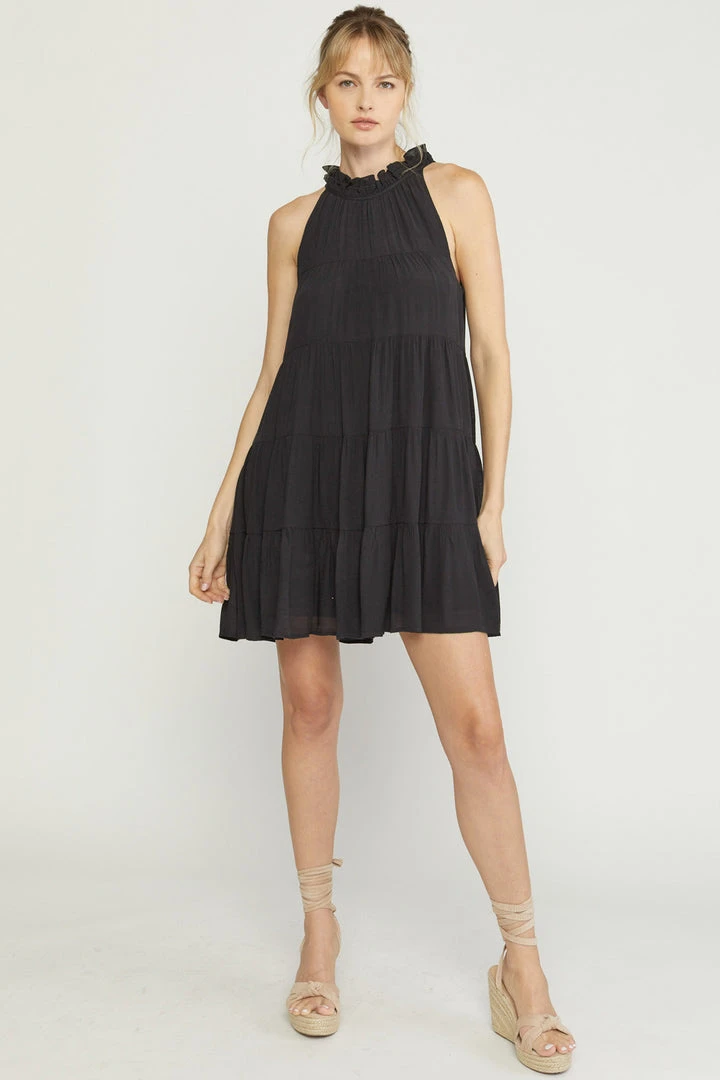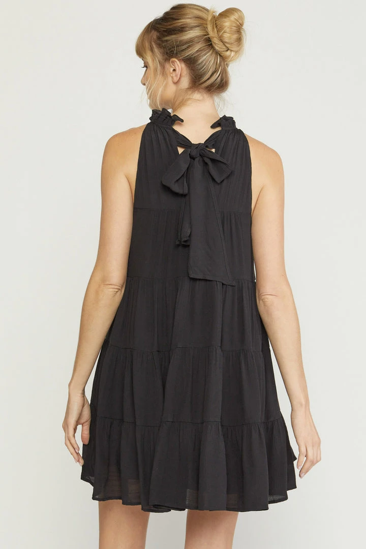 Flowy tiered dresses are all the rage right now and we are so here for it!! This adorable black dress is sleeveless and features a ruffled mock neck with self tie closure in back, and has pockets. Wear her alone on warm days, then pair with a denim jacket when the weather cools!