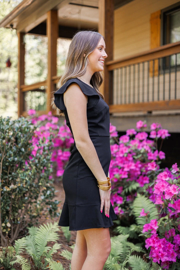 Black knit dress with ruffle capped sleeves
