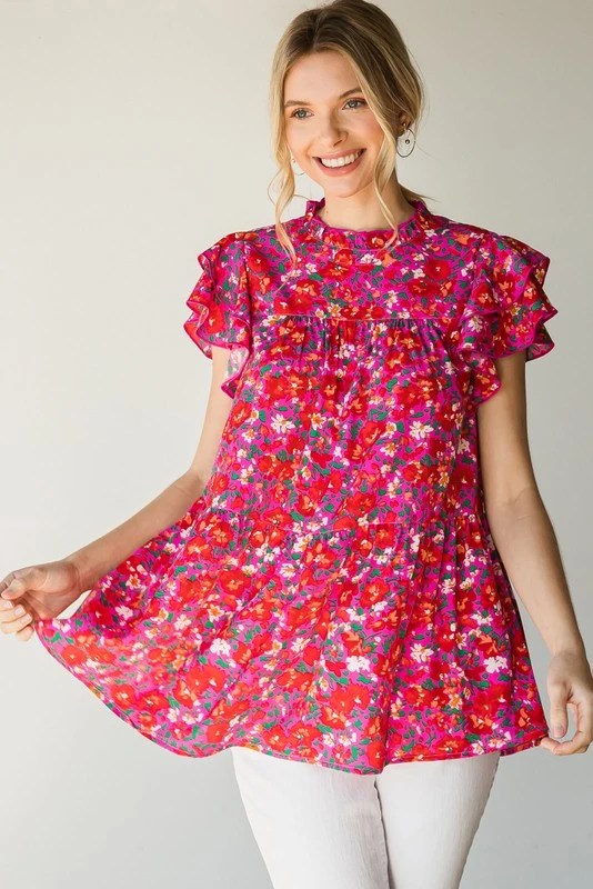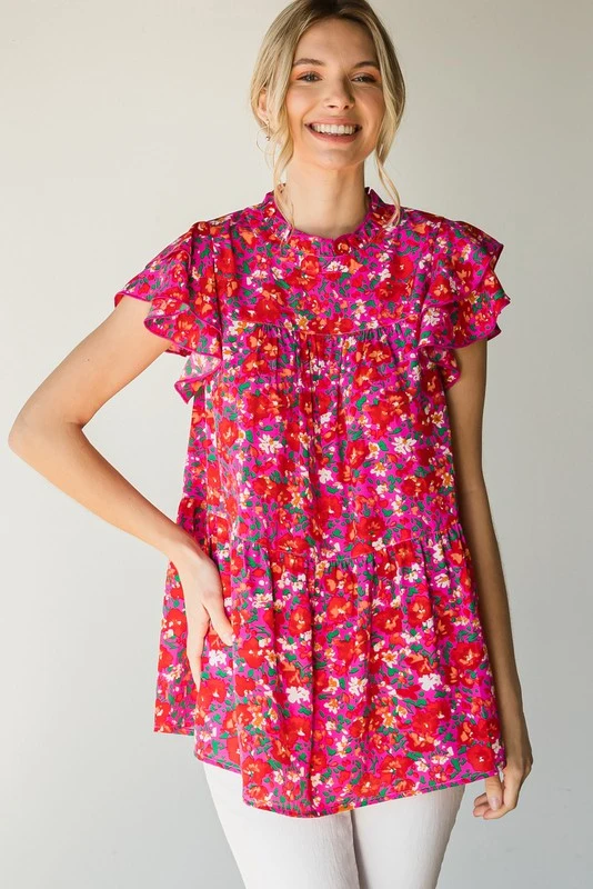 The perfect little babydoll top for all of your upcoming occasions… just add your favorite jeans and wedges and you’re all set. Simple yet fabulous! Hot pink top with floral print, featuring a ruffled mocked neck with keyhole button closure in back,ruffle capped sleeves, and tiered layers. So cute!