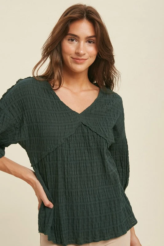 The perfect little babydoll top for all of your upcoming occasions… just add your favorite jeans and wedges or booties and you’re all set. Simple yet fabulous! Emerald green textured crinkle top with a v neckline, elastic cuffed 3/4 length balloon sleeves, and raw edge details. So cute!