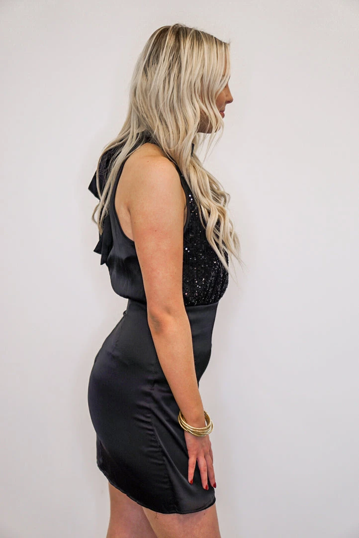 We are here for this one girls! Black satin sleeveless dress, featuring a black sequin bodice, a chic halter neck with self tie in back, and double button and zip closure. This beautiful babe has a fabric overlay at the front, with gathered details at the sides. Perfect for any special occasion, from date nights, to Holiday parties. Classic black goes with every season!