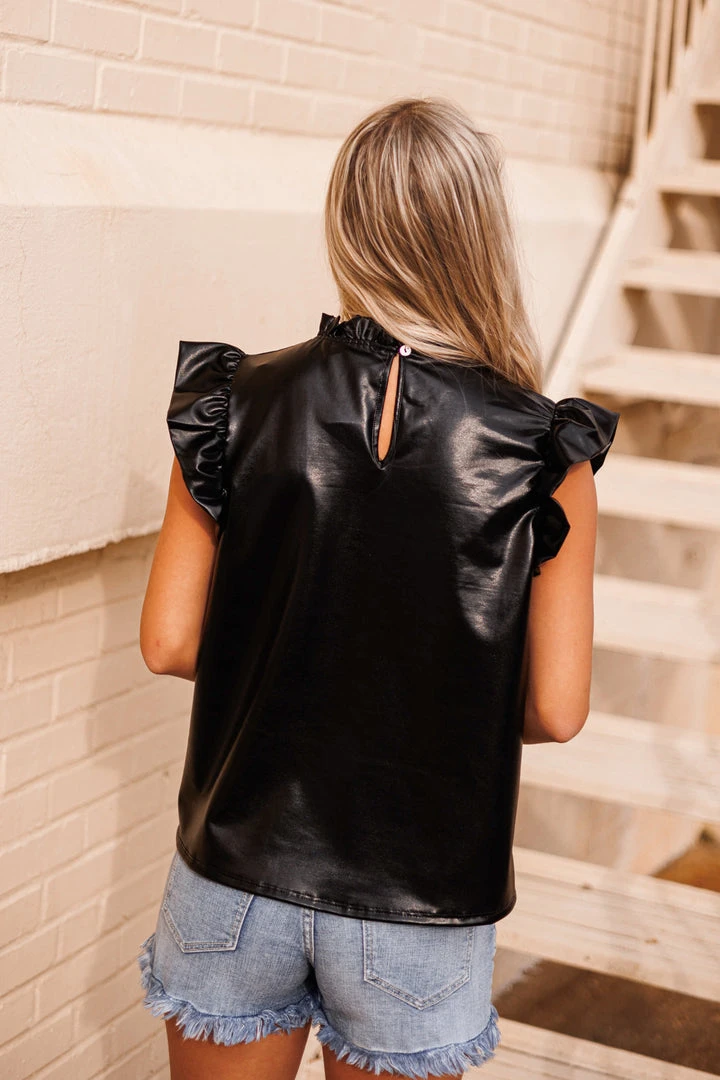 Metallic black ruffled pleather top