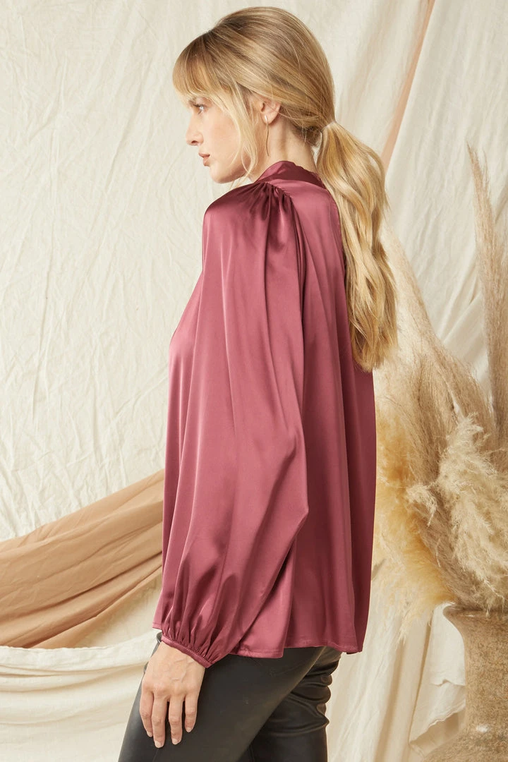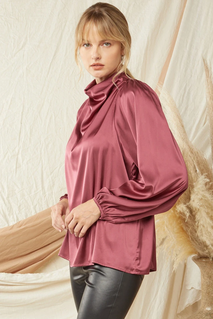 Sweet meets sassy in this super cute merlot blouse. Featuring a satin lightweight fabric, a cowl neck with double button keyhole closure in back, and elastic cuffed long sleeves. This one will be perfect dressed up for all of your upcoming events!