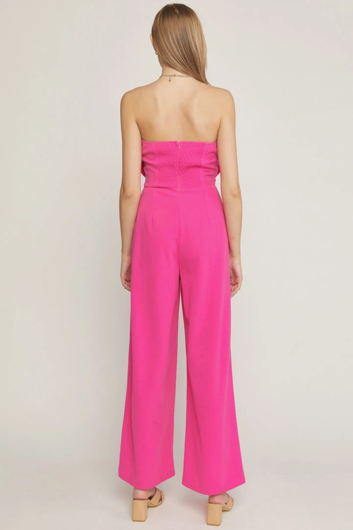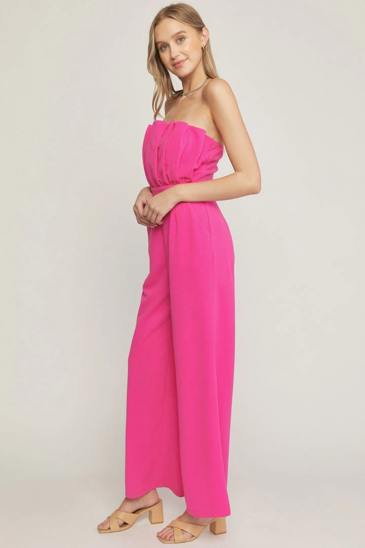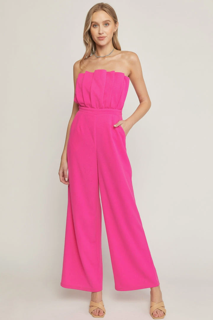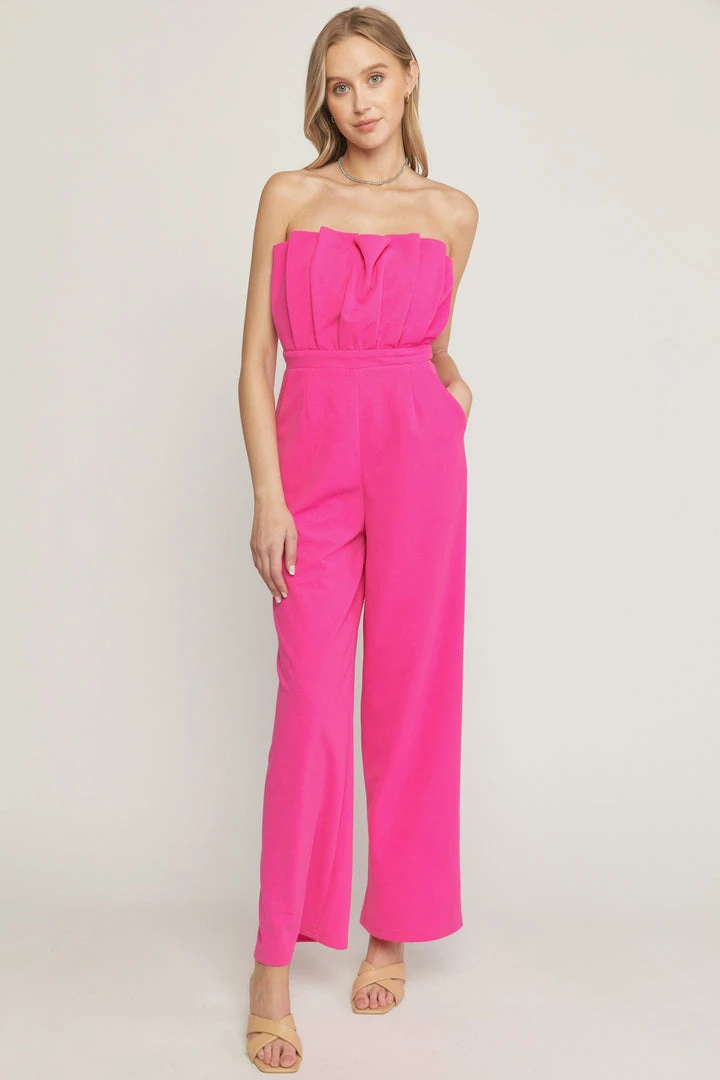 Yes we are obsessed with this pretty jumpsuit and will be too! It has all the dressy vibes featuring a pleated bust, with a strapless neckline. This babe also has flowy wide legs and pockets. Add your favorite shoes and jewelry and you’re ready for any occasion.