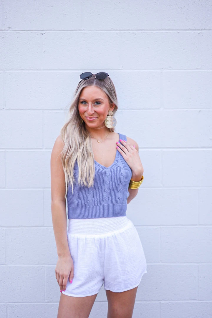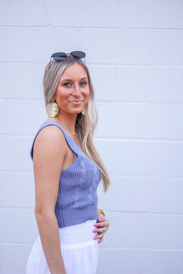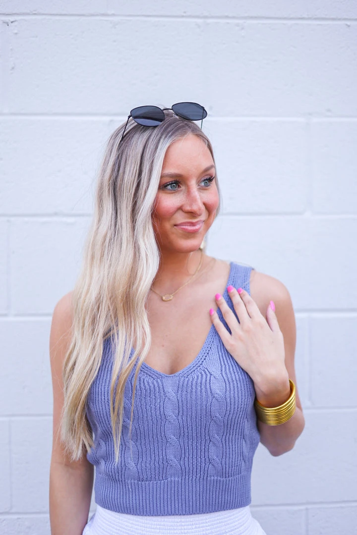 Such a cute combo… sweater, cropped, tank top. Perfect! Featuring a v neckline in front and back, wide tank straps, and fitted silhouette with ribbed hem. This cutie is adorable worn alone, or under your favorite blazer or cardigan. We love love love!