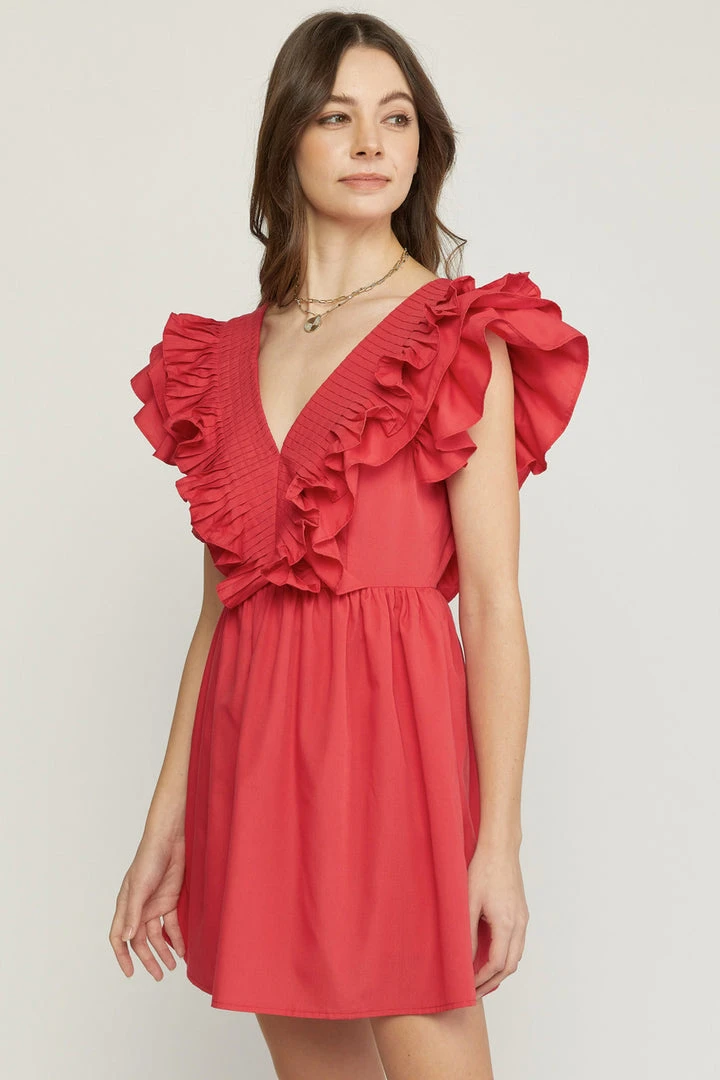 Red pleated v neck dress with ruffle capped sleeves