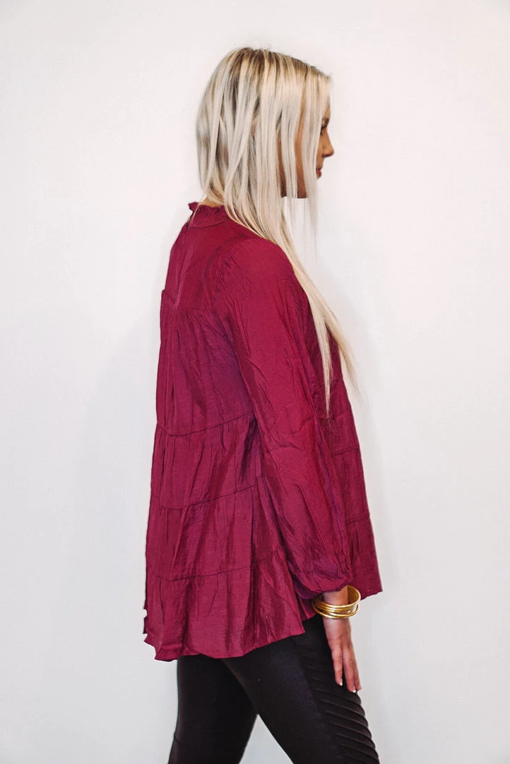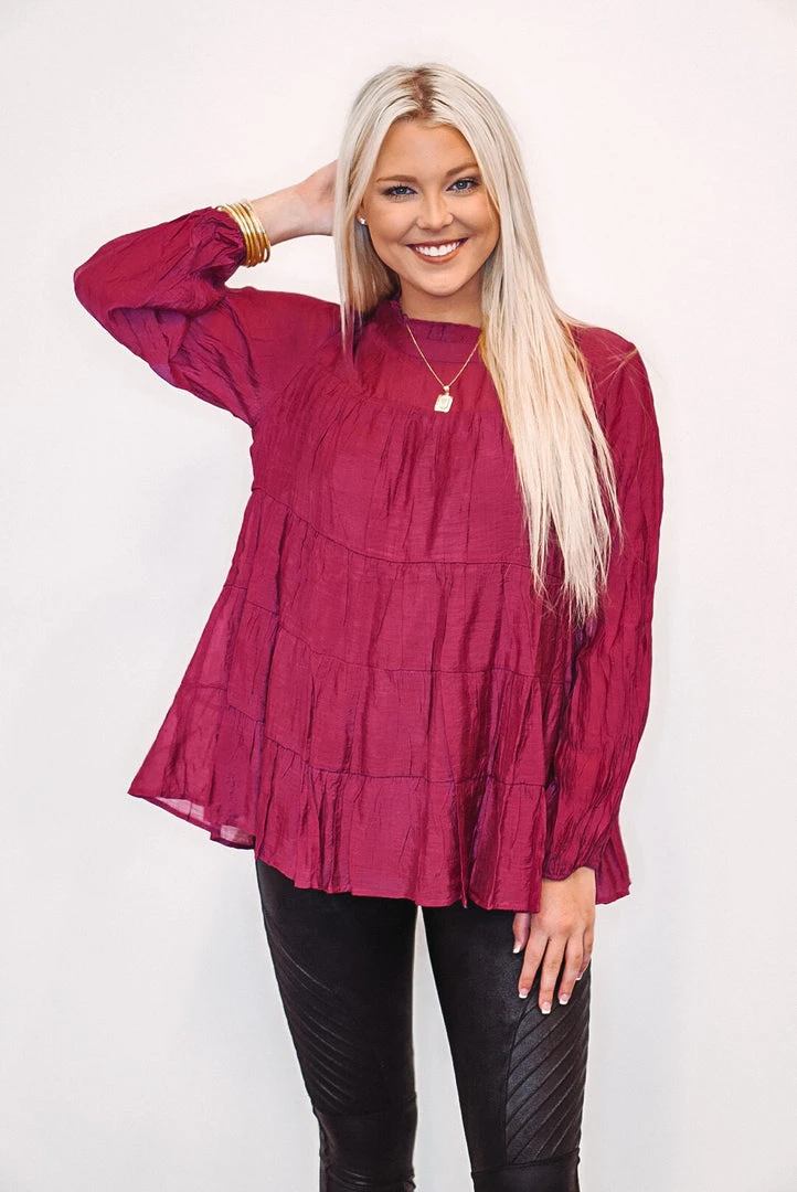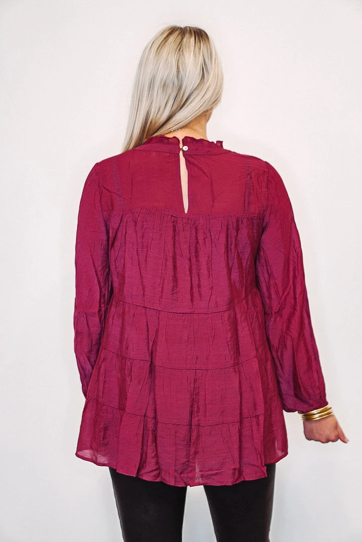 The perfect little top for all of your upcoming events… just add your favorite jeans and booties, or skirt and heels, and you’re all set for any occasion. Simple yet fabulous! Magenta top featuring a ruffled mock neckline with keyhole button closure in back, elastic cuffed long bubble sleeves, and tiered layers. So cute!