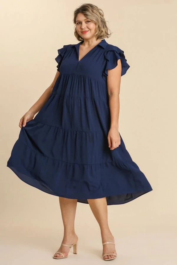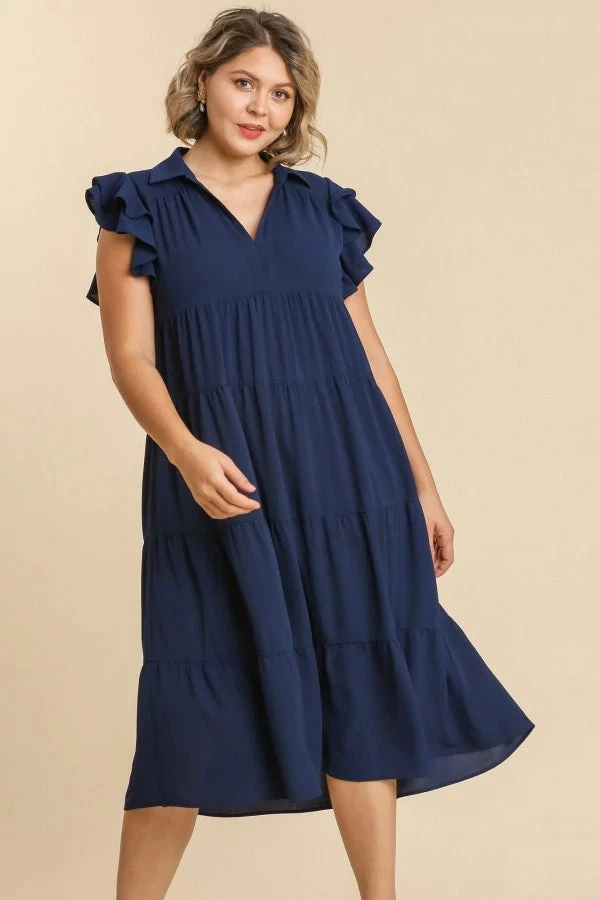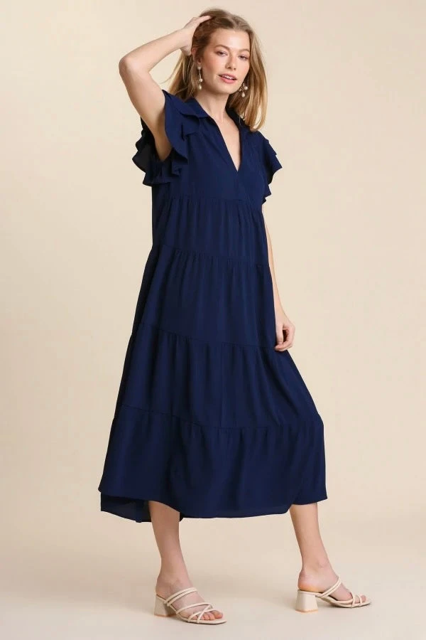 This super cute flowy midi dress features a very pretty navy fabric, with a collared v neckline, short ruffle sleeves, and tiered layers. The perfect dress for all of your upcoming occasions!