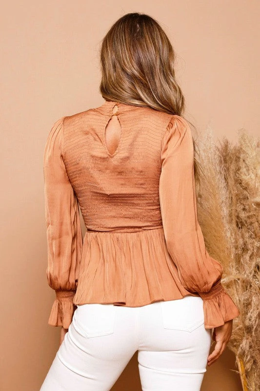 Satin smocked peplum top in caramel