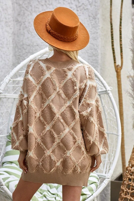 How fabulous is this timeless piece? This stylish little number features a textured grid pattern design in a pretty taupe and ivory color and ribbed cuffed long bubble sleeves. This cozy babe will keep you warm all season long. Pair this cute cardigan with a simple tee, jeans, and booties for a cute casual look!