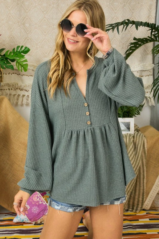 The cutest top for this Fall and Winter! You will be wearing this textured knit babe every day because she’s as comfy as she is cute. Featuring a relaxed fit in a peplum style, faux button details under the v neckline, and cuffed long puff sleeves. Perfect worn long, or with a side tuck. Just add your favorite denim and you’re ready for anything!