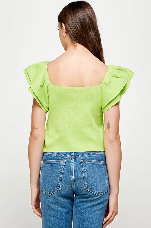 Girls we have found the cutest top! This lime knit babe features a square neckline, and pleated double ruffle capped sleeves. She will be perfect dressed up or down, the choice is all yours. Just throw on your favorite denim shorts and sandals or booties, and go!
