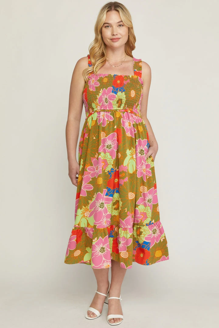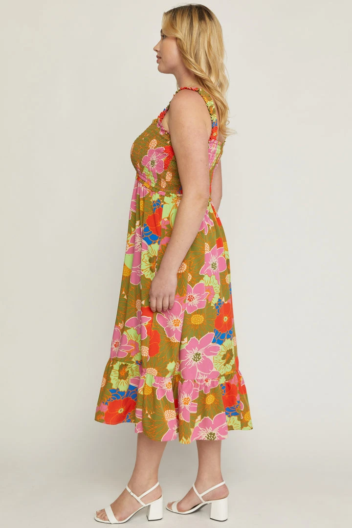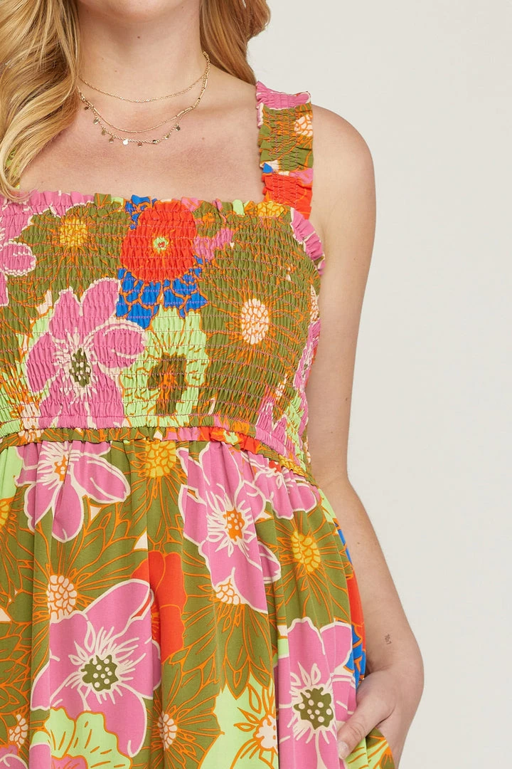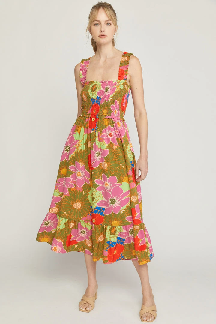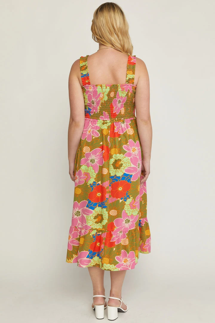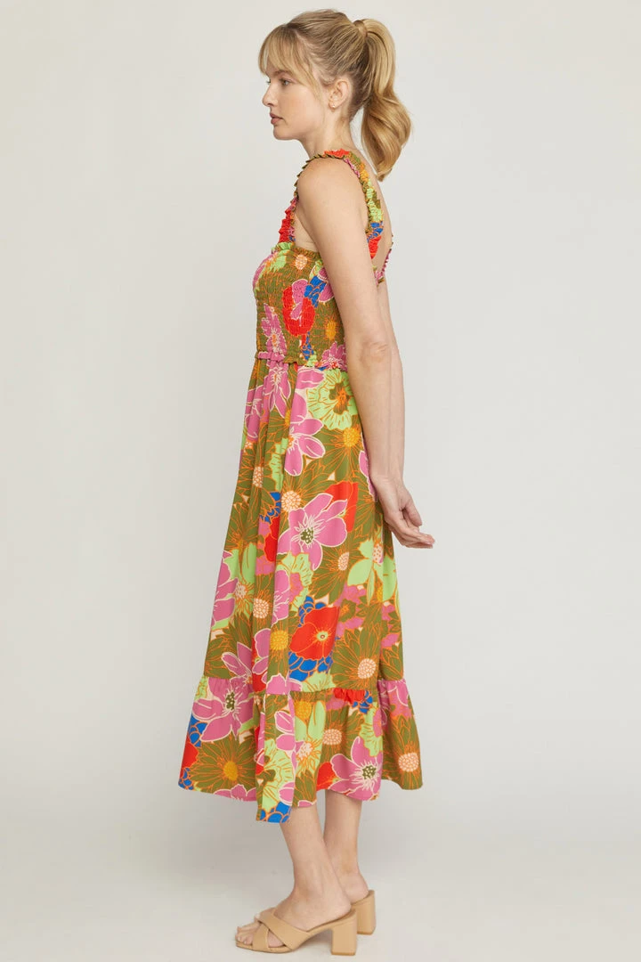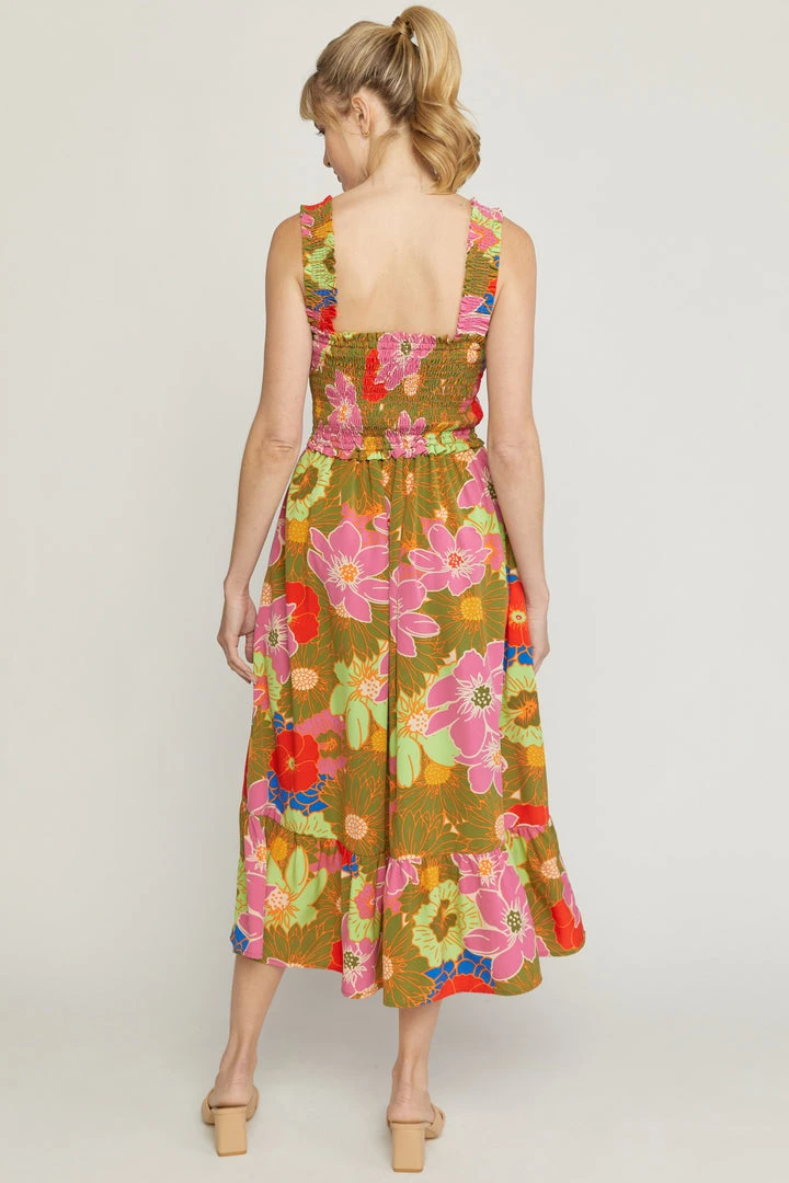 This vibrant floral print square neck midi dress is a must have for all of your summer occasions! Perfect for the beach or just a summer night date. Beautiful colored sleeveless dress featuring smocked bust and a ruffle skirt hem.