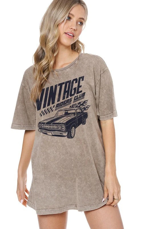 Everyone loves a cute graphic tee! This babe is mineral washed mocha and features a classic vintage car graphic with the words Vintage Riders Club all in black. Perfect with your distressed denim and boots! Â