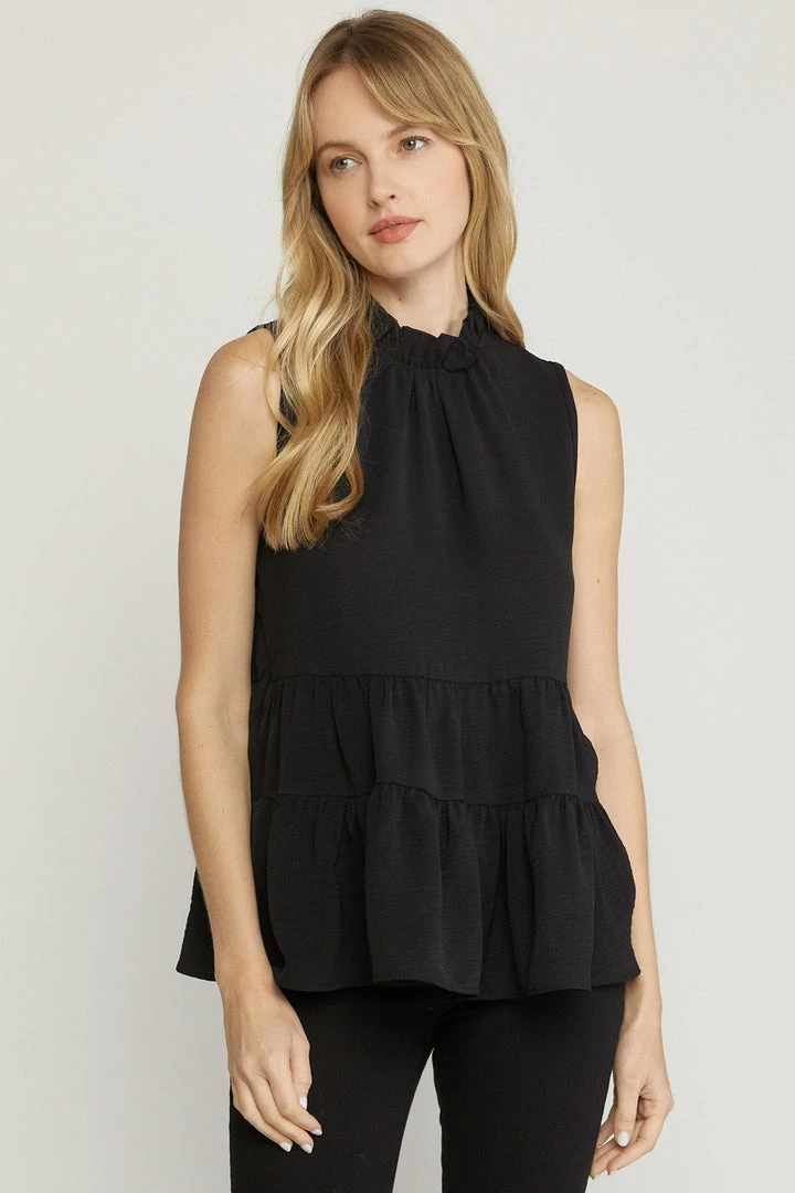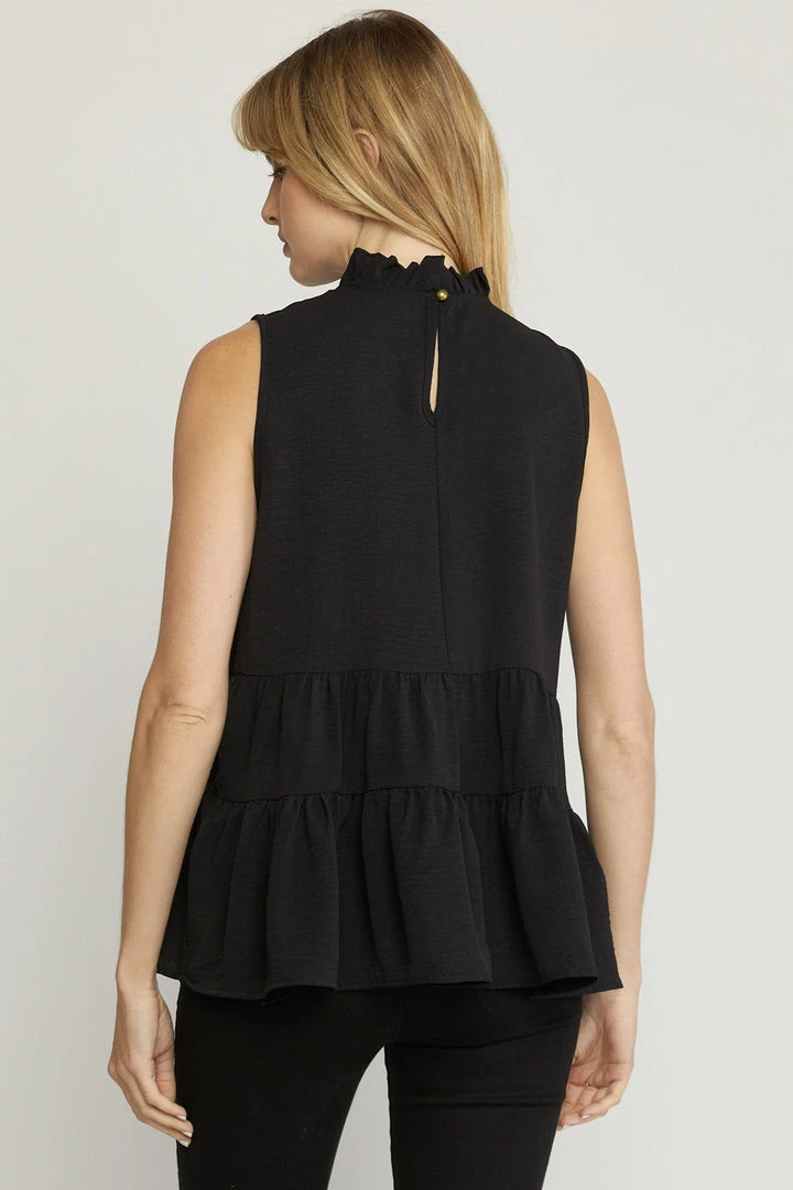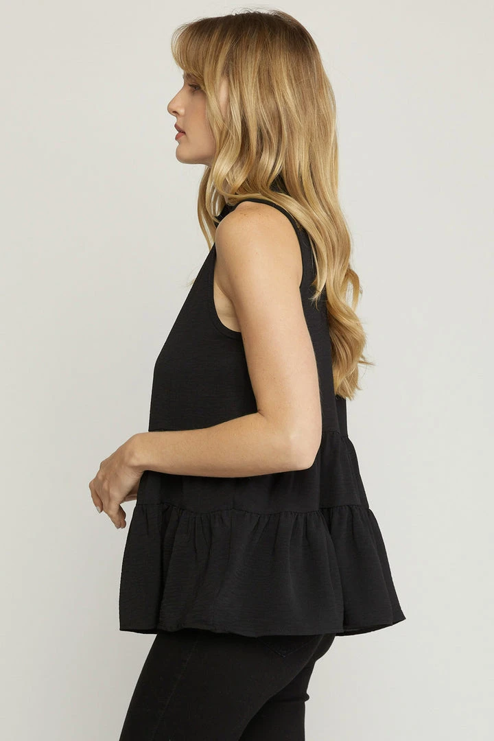 The perfect little top for all of your upcoming occasions… just add your favorite jeans and sandals or booties and you’re set. Sleeveless solid tank with a ruffled mock neckline, keyhole button closure in back, and tiered layers. So cute!