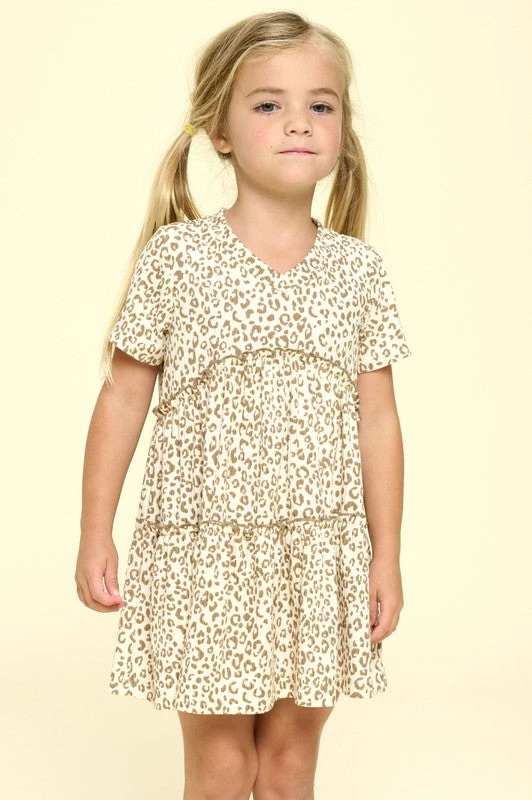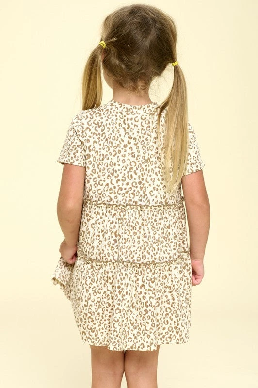 Your little one will love this cute babydoll dress! Leopard print ribbed fabric, featuring a v neckline, short sleeves, and ruffled tiers. So adorable!