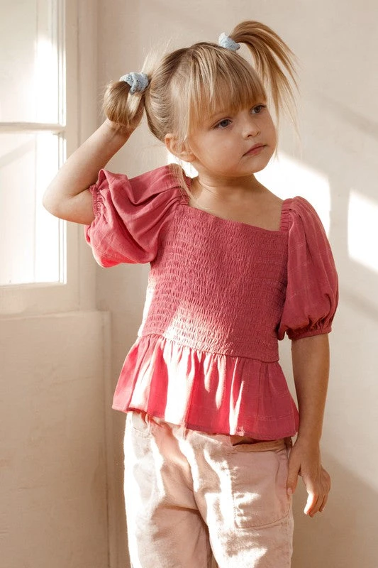 This sweet peplum blouse is the perfect addition to your mini me’s wardrobe! Featuring a smocked bodice, square neckline, elbow puff sleeves, and a soft woven fabric that is durable and breathable. Super cute, and comfy!