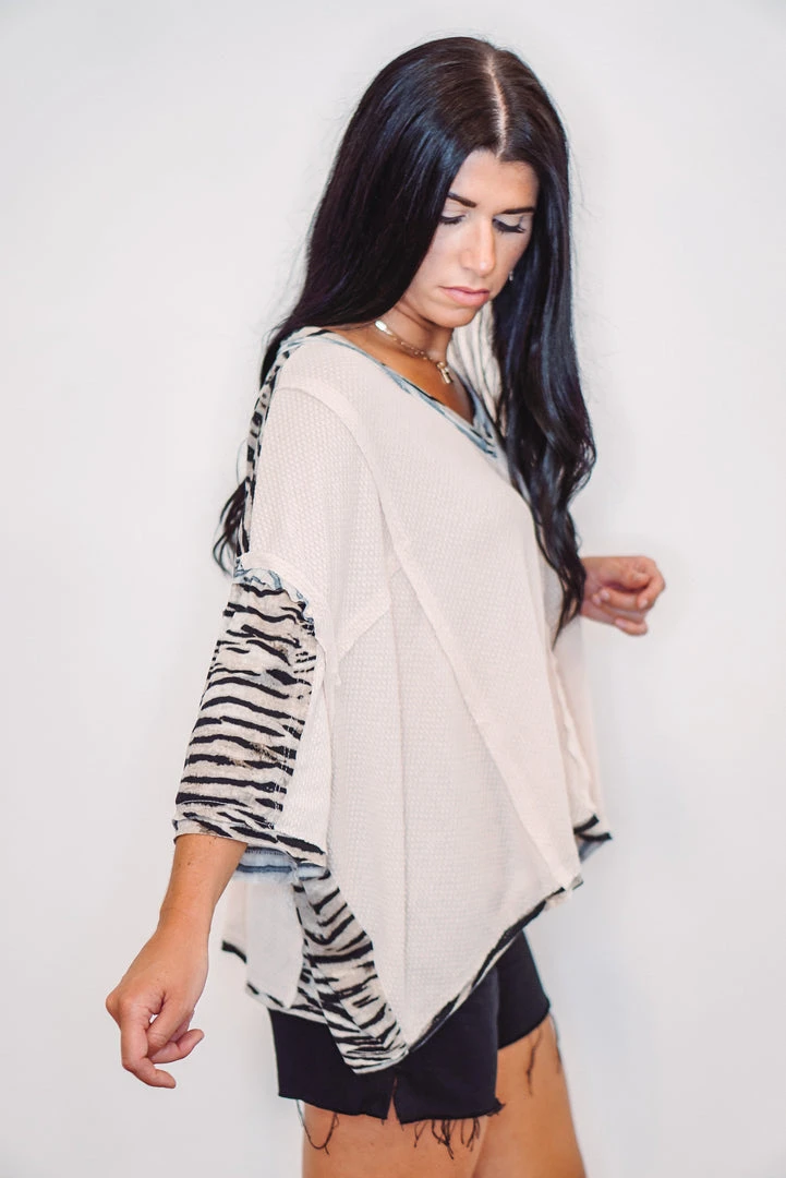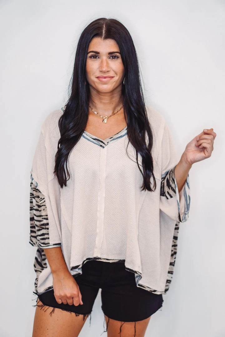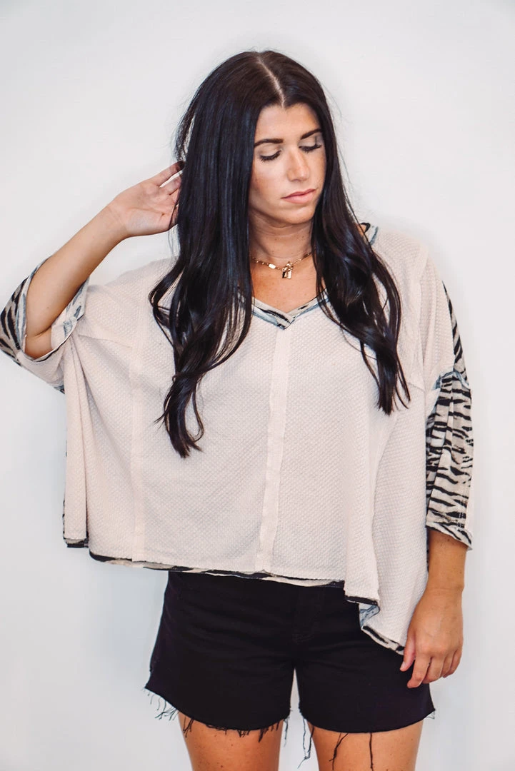 Beige Oversized Waffle Knit Top With Zebra Print Details
