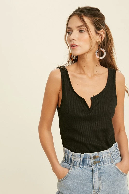 The notch details on this black tank top is such a big trend right now! If you are in need of a tank to pair with your skirts and want the fitted look of a “bodysuit” without an actual bodysuit then this is the top you need! Tank top features a lightweight soft waffle knit fabric.