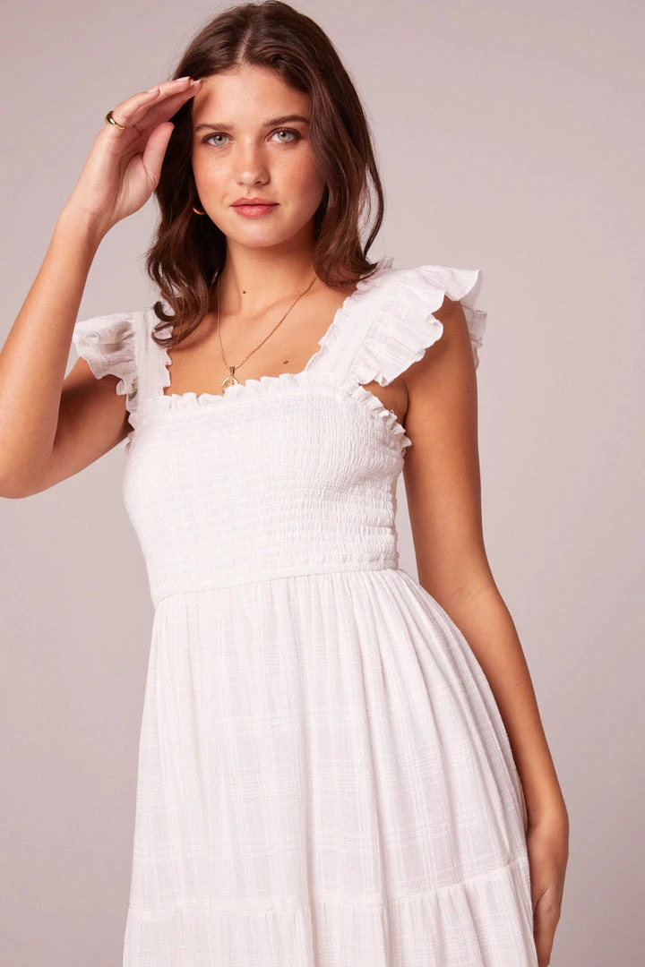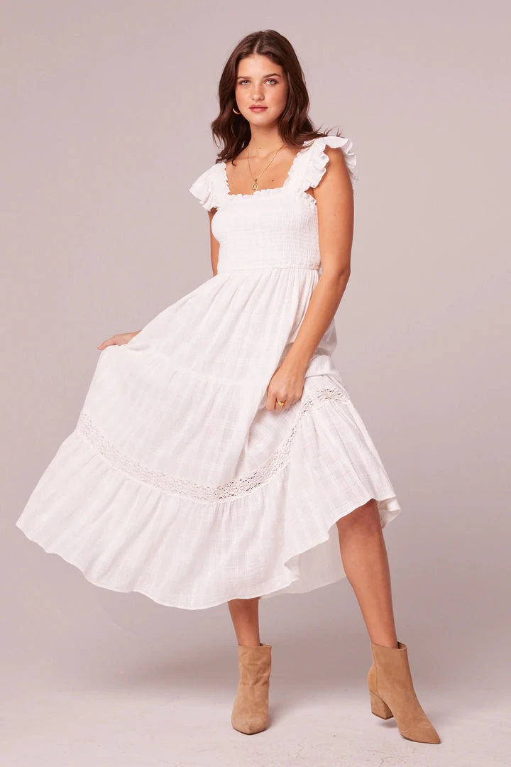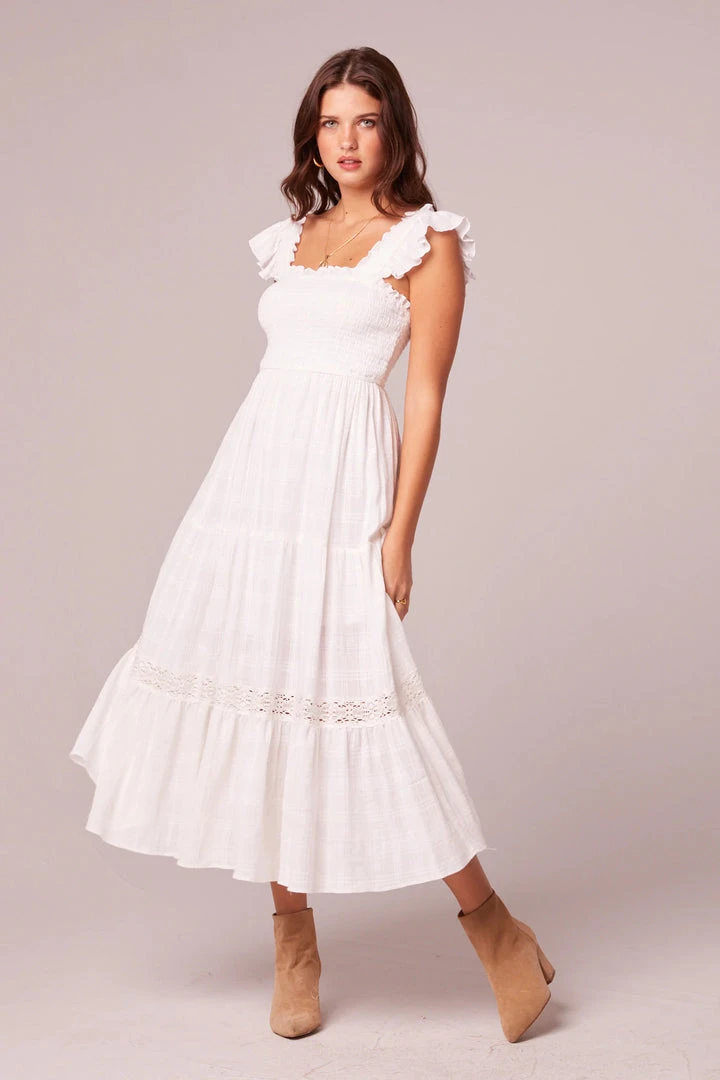 Bridal ready, our Odessa dress’s ruffle cap sleeves, lace insets, and tiered skirt is perfect for all bridal celebrations