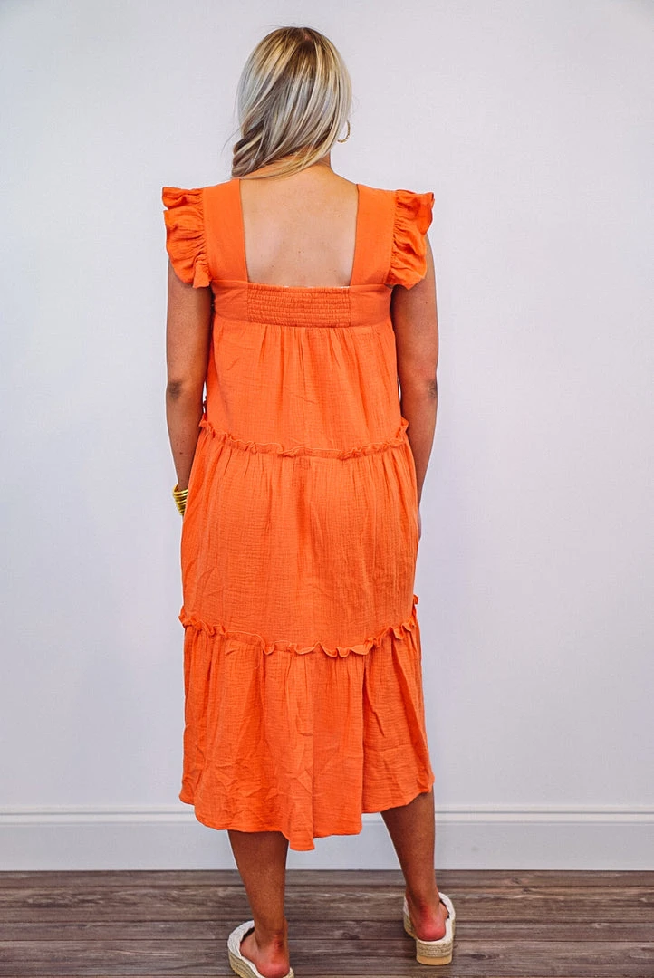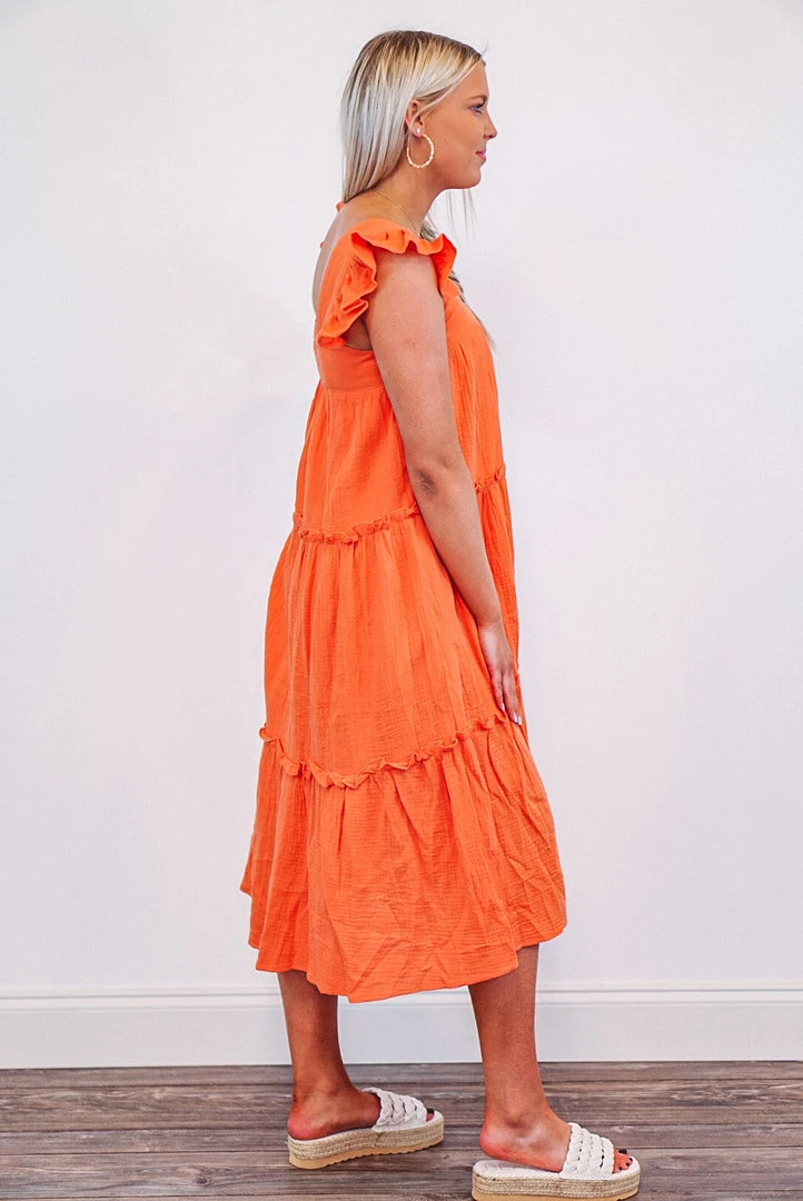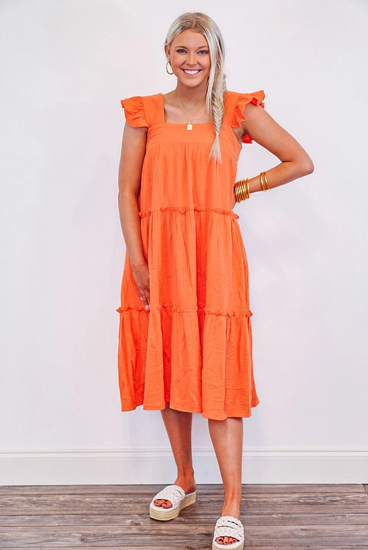 You’re going to love this one girls! Orange gauze midi dress featuring a chic square neckline with smocking in back, ruffle tiered layers, and pockets. This cute babe is sleeveless with ruffle details. Perfect for all of your upcoming events! She’ll also look super cute paired with your favorite cropped denim jacket.