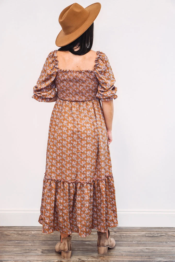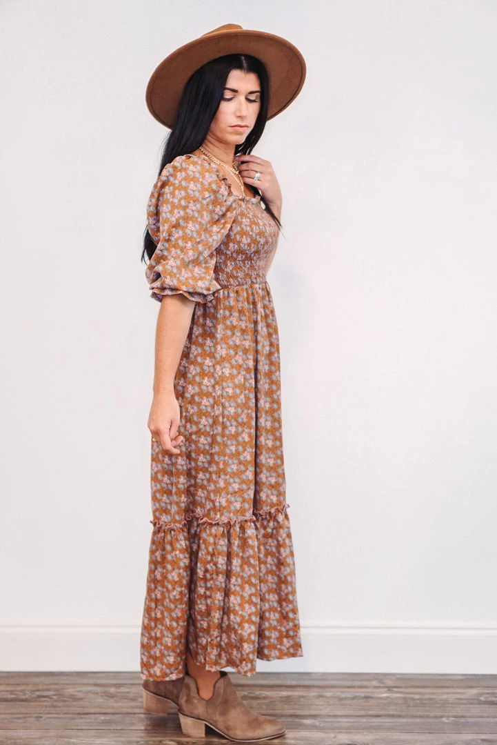 Dark mauve paisley smocked midi dress