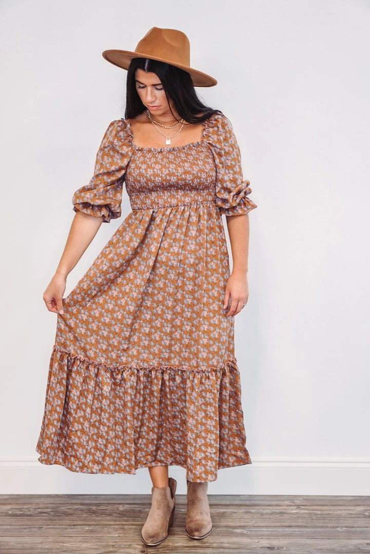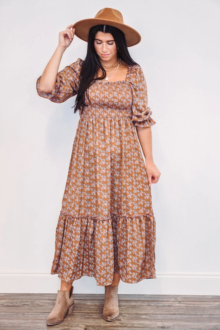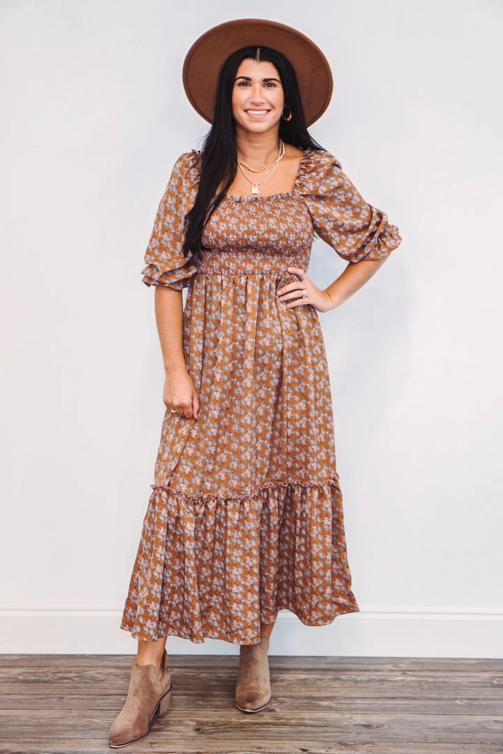 We are all about this paisley midi dress! Featuring a smocked top, square neckline, ruffled detail near the bottom hemline, and ruffle cuffed 3/4 length sleeves that can be pulled down off the shoulder, or worn up on the shoulder. This sweet thing is dark mauve with a perfectly blended paisley print. The pretty details and lightweight fabric make this dress just right for a day out with friends, or any of your upcoming events!