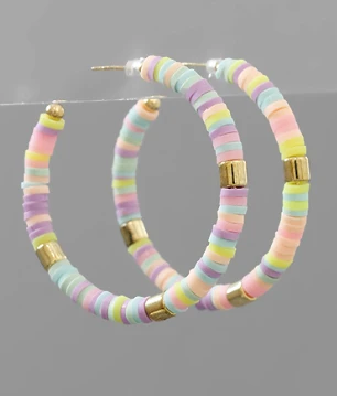 Beaded hoops are a must have this season! We are loving these pastel colored rubber beaded hoops with gold bead accents. They are just too cute! Pastel colors: pink, light mauve, lavender, lime and mint.