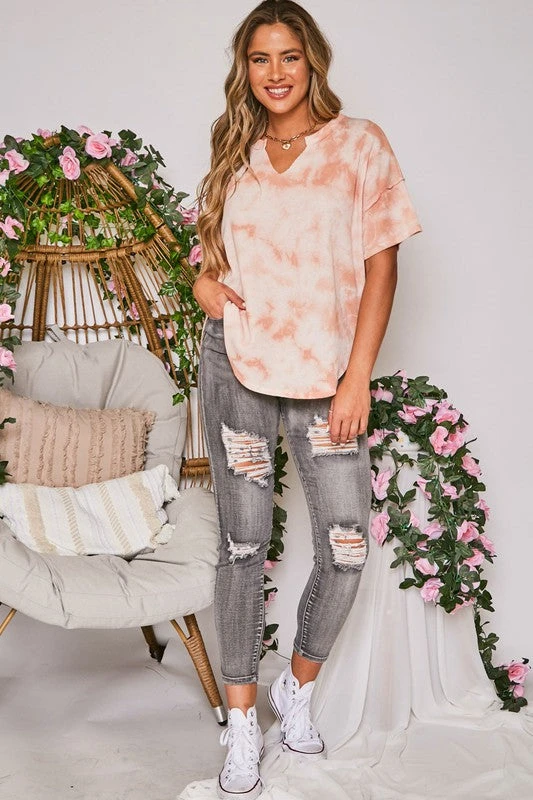 Girls this peach tie dye waffle tee is so pretty! Featuring a V neckline, and raw detailing on the hemlines. She is perfectly oversized, and oh so soft! You will love this cutie over biker shorts, or with a side tuck in your favorite denim cut offs. Soon to become one of your favorites!