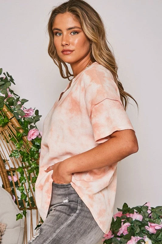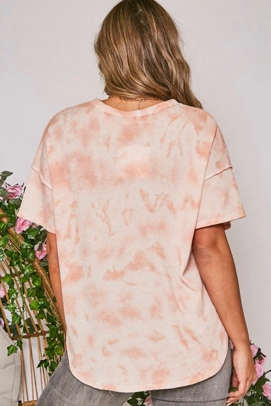 Peach Tie Dye Oversized Waffle Knit Short Sleeve Top