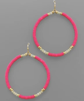 Beaded hoops are a must have this season! We are loving this pink rubber and glass beaded pair. They are closed hoops, and feature gold bead accents. So pretty!