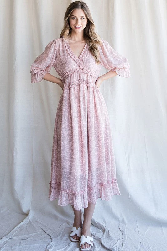Your new fave dress! Wear this cutie on a casual errand running day with a denim jacket, on a vacay road trip with booties, or simply dress it up with heels and a chunky necklace. So many options with this pink leopard midi dress. Featuring a ruffle trimmed v neckline, ruffled elastic cinched waist, elastic ruffle cuffed bubble half sleeves, and ruffled hemline. Perfect for all of the upcoming seasons!
