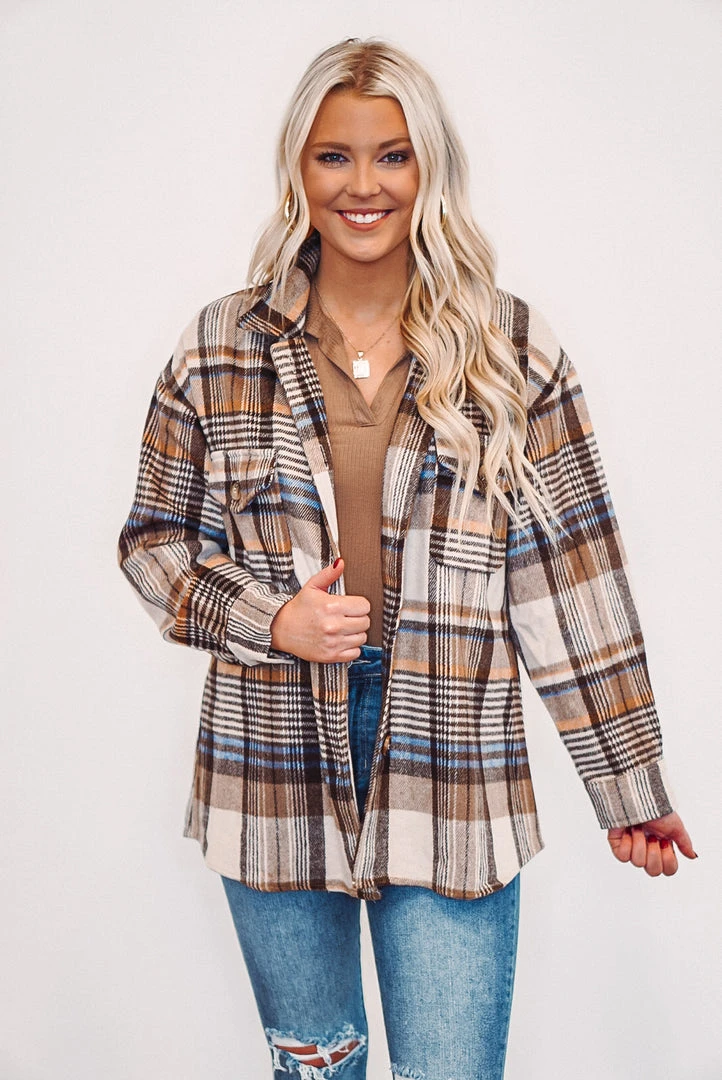 We are loving this brown plaid flannel shacket, it’s a must have trend this season! It features a button up style, button close two front chest pockets, and a thicker fabric to keep you warm and cozy. It’ll be the perfect addition to your wardrobe and great to layer with your bodysuits and jeans. Plaid colors are bown, tan, ivory, blue, and mustard…. a perfect combination!